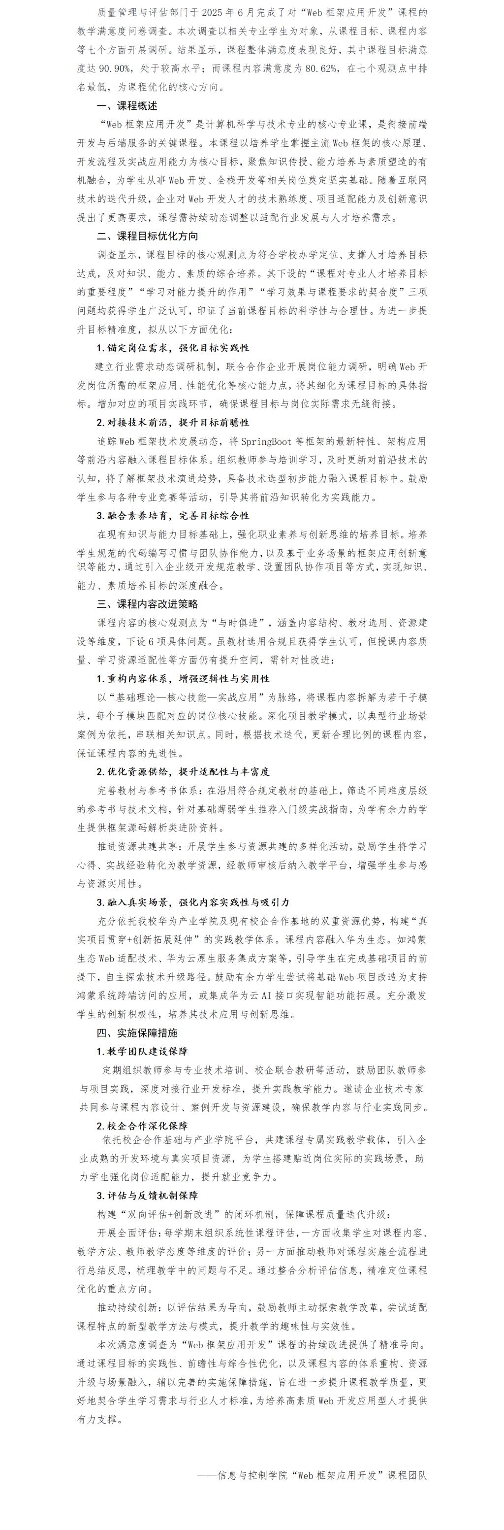 “Web框架应用开发”课程教学反馈与持续改进报告